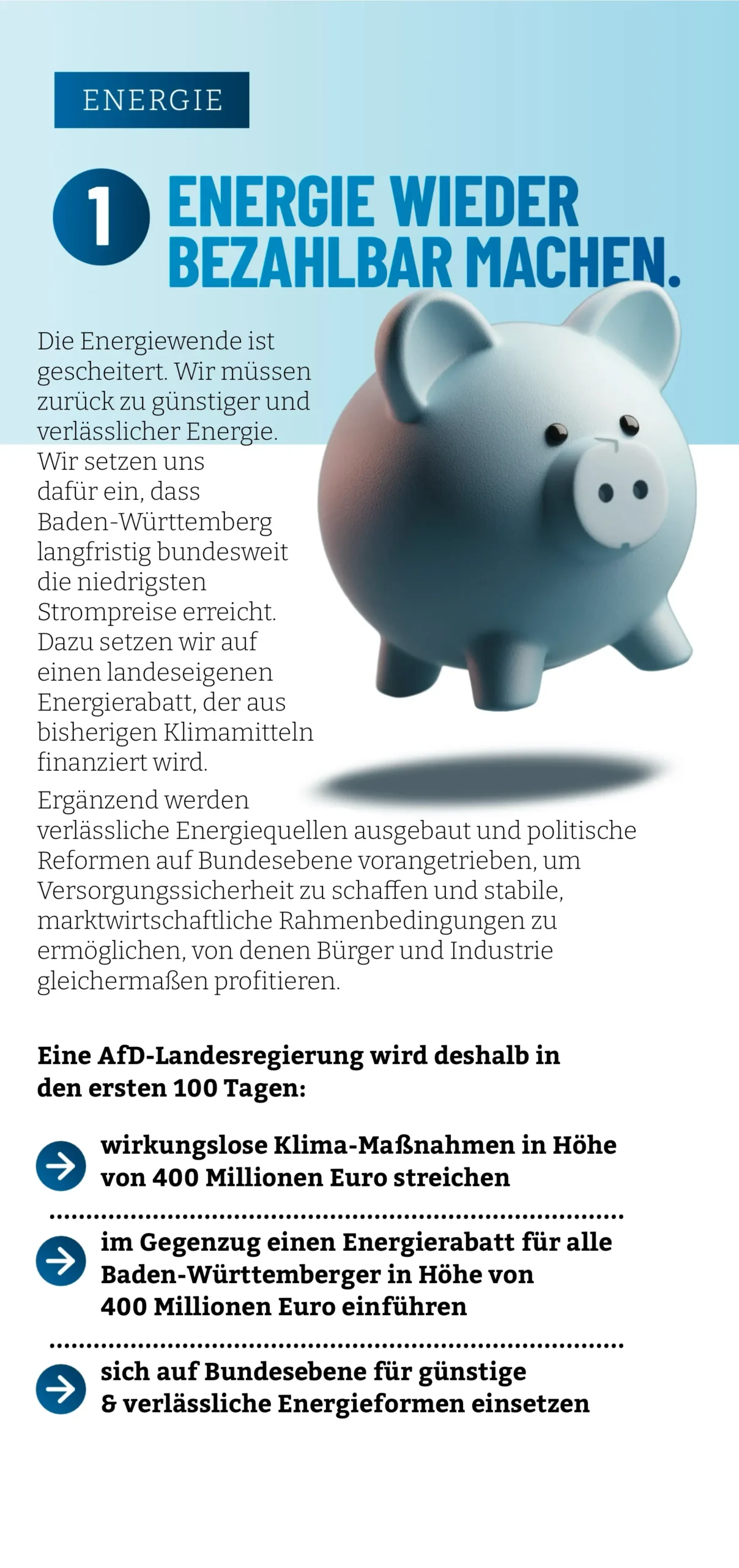 Wir werden dafür sorgen, dass Baden-Württemberg die niedrigsten Strompreise in ganz Deutschland hat. Dafür werden wir als erste Sofortmaßnahme die über 400 Millionen Euro, die von der bisherigen Landesregierung jährlich in weitgehend wirkungsfreie Klimaschutzmaßnahmen gesteckt wurden, in einen landeseigenen Energierabatt für Unternehmen und Bürger umleiten. Dies wäre auch ein Wettbewerbsvorteil gegenüber anderen Ländern mit höheren Energiepreisen. Im Bruttoinlandsprodukt pro Kopf soll nach fünf Jahren AfD-Regierung Baden-Württemberg Bayern überholen!