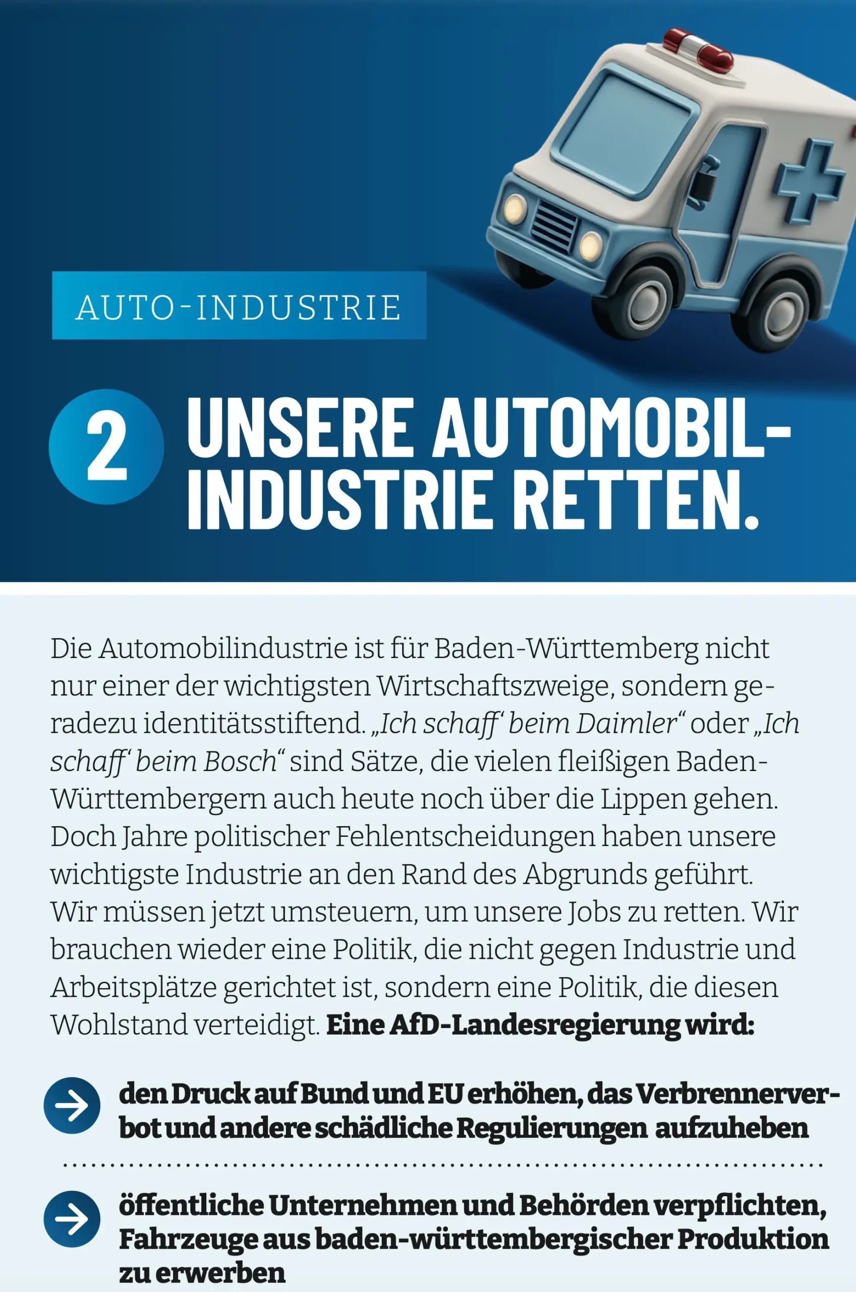 Eine AfD-Regierung würde alle ihr zur Verfügung stehenden Hebel in Bewegung setzen, um die Automobilindustrie in Baden-Württemberg zu retten. Ministerpräsident Frohnmaier würde ein „Buy BW“-Programm aufsetzen, durch das alle öffentlichen Unternehmen des Landes und Behörden verpflichtet wären, für ihren Fuhrpark künftig nur noch Automobile aus baden-württembergischer Produktion zu erwerben.