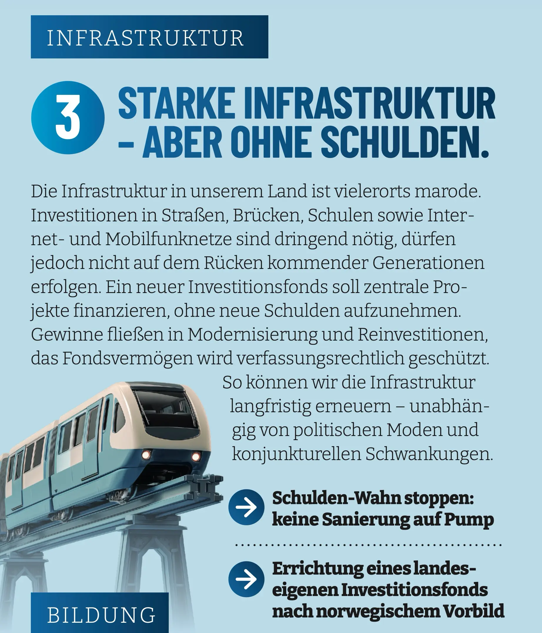 Die Infrastruktur in unserem Land ist vielerorts marode. Investitionen in Straßen, Brücken, Schulen sowie Internet- und Mobilfunknetze sind dringend nötig, dürfen jedoch nicht auf dem Rücken kommender Generationen erfolgen. Ein neuer Investitionsfonds soll zentrale Projekte finanzieren, ohne neue Schulden aufzunehmen. Gewinne fließen in Modernisierung und Reinvestitionen, das Fondsvermögen wird erfassungsrechtlich geschützt. So können wir die Infrastruktur langfristig erneuern – unabhängig von politischen Moden und konjunkturellen Schwankungen.