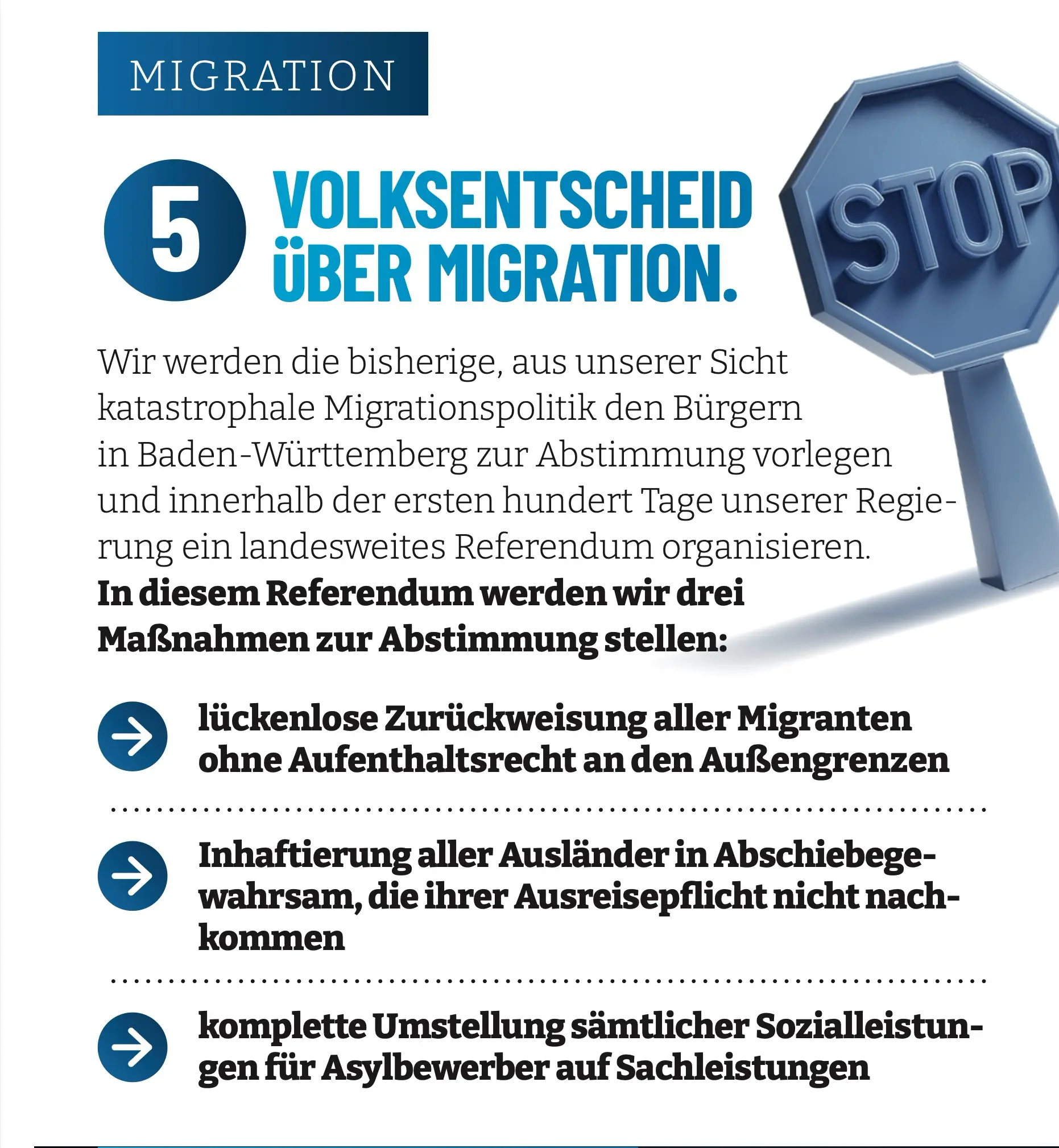 Wir werden die bisherige, aus unserer Sicht katastrophale Migrationspolitik den Bürgern in Baden-Württemberg zur Abstimmung vorlegen und innerhalb der ersten hundert Tage unserer Regierung ein landesweites Referendum organisieren. In diesem Referendum werden wir drei Maßnahmen zur Abstimmung stellen: