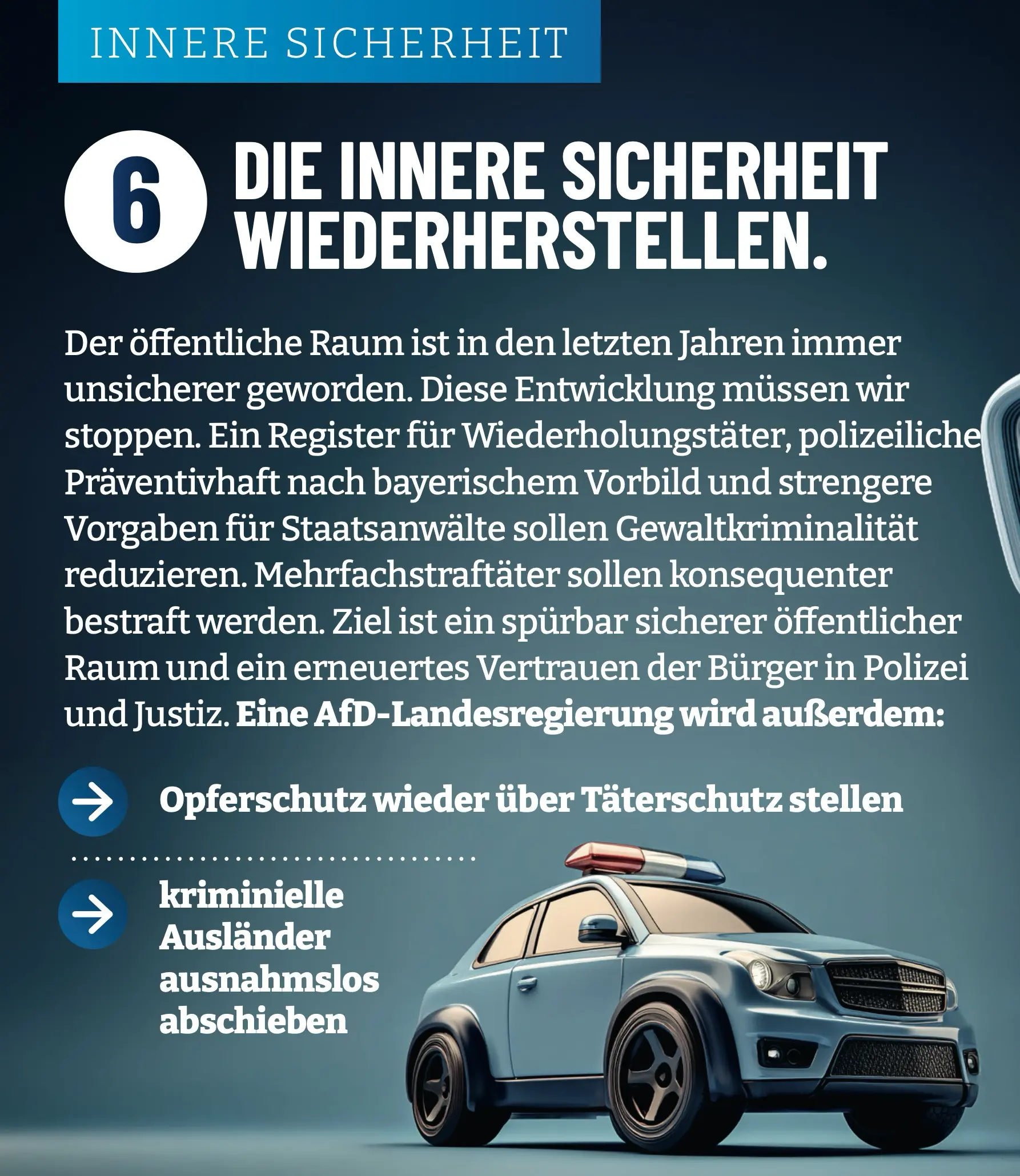 Eine AfD-geführte Landesregierung wird daher resolut gegen gewalttätige Kriminelle vorgehen. Innerhalb der ersten hundert Tage werden wir ein landeseigenes Register zur Erfassung von Wiederholungstätern und nach bayerischem Vorbild eine polizeiliche Präventivhaft gegen gefährliche Gewaltkriminelle einführen. Zudem werden wir die Richtlinien für Staatsanwälte so überarbeiten lassen, dass diese bei wiederholten Gewalttätern zwingend auf Verurteilungen zu Freiheitsstrafen ohne Bewährung hinzuwirken haben. Ziel muss es sein, notorische Gewalttäter aus dem Verkehr zu ziehen und unsere Bürger zu schützen. Kriminelle Ausländer sind natürlich ausnahmslos abzuschieben.