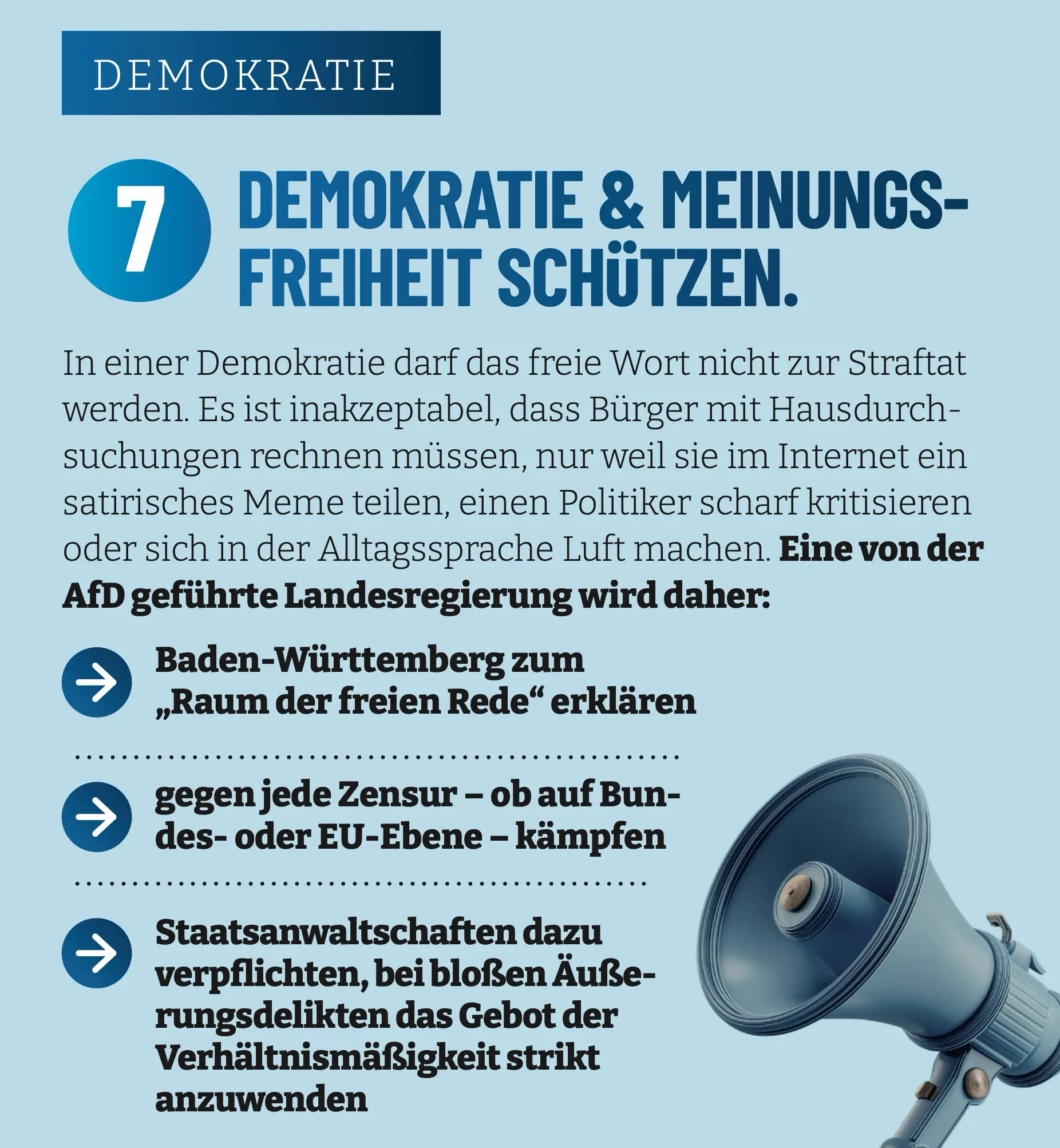 Die von der AfD geführte Landesregierung wird Baden-Württemberg deshalb in den ersten hundert Tagen zum „Raum der freien Rede“ erklären. Staatsanwaltschaften im Land werden dazu verpflichtet, bei bloßen Äußerungsdelikten – insbesondere im digitalen Raum – das Gebot der Verhältnismäßigkeit strikt anzuwenden. Ermittlungsverfahren, die allein wegen Meinungsäußerungen geführt werden, sind im Regelfall nach § 153 StPO einzustellen.