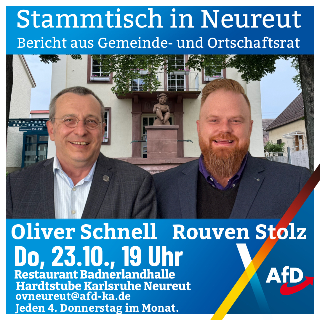 Ihre Vertreter im Gemeinderat und Ortschaftsrat, Oliver Schnell und Rouven Stolz, berichten aus erster Hand über die Entwicklungen und Beschlüsse in Karlsruhe und Neureut.